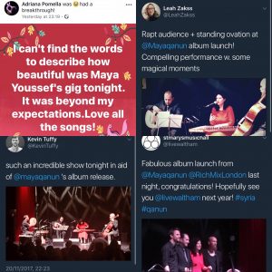 I can not express how grateful I feel after last night’s SOLD OUT album launch at Rich Mix London. HUGE thank you to every one who worked hard with me to deliver this project; my beautiful family, Sasa Music-Agency Carthage Music harmonia mundi international, Joe Boyd JerryBoys Max Reinhardt MARSM UK the amazing wonderful musicians, all the individuals, journalists who are helping to spread my message of peace and music, THANK YOU from all my heart. Of course, HUGE thanks to the most INCREDIBLE audience! The magic and the love that filled the room was just transcendental to say the least. Thank you for one of the best nights in my life and the best birthday EVER! So much love and gratitude!